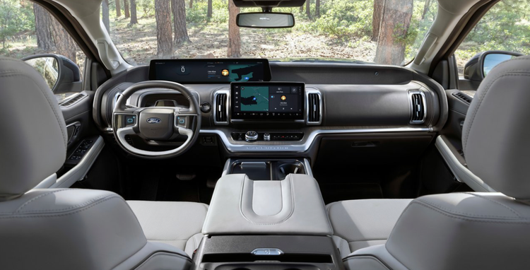 但是它针对不同车款,做了不同的调校,像King Ranch和Active版本的车型,它的最大马力400匹,最大扭力651N·m。而Platinum和Tremor车型的动力则是要更强一些。内饰全新设计从图上我们看到,福特Expedition的内饰是有很大的变化。特别是它的液晶仪表和24英寸全景中控屏幕。错落的布局是不是有些眼熟?这是之前法系车上有过的中控布局。
