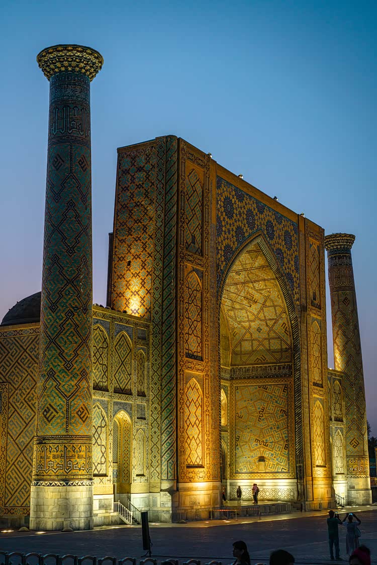 雷吉斯坦广场是个城市广场,首都人民会聚集在这里听去皇告,乃至围观罪犯公开处刑。 广场是由三栋独特的伊斯兰建筑形式的伊斯兰学校所构成。在中世纪既是全城的商业中心,也是中亚最重要的学术中心。