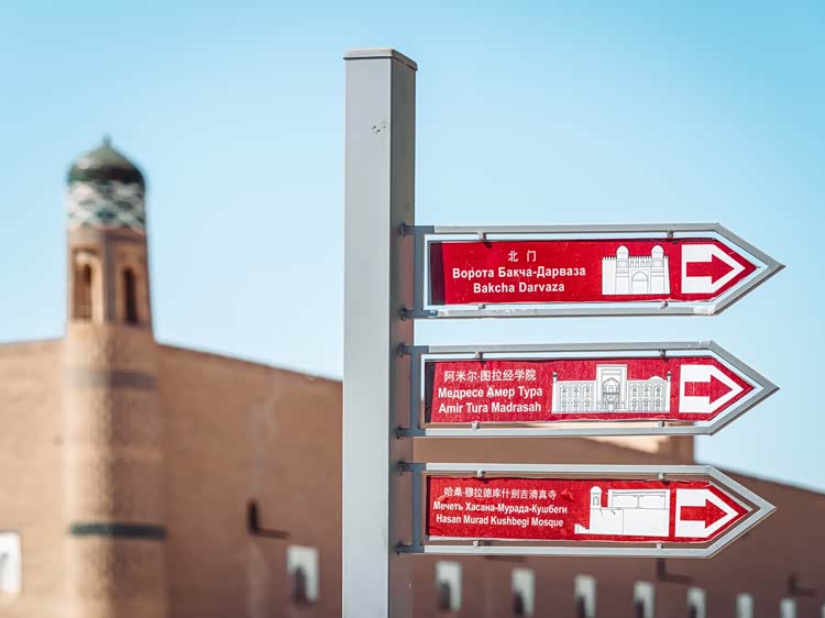 在古城的一角,有一块特别的路牌,上面的指示用语由乌兹别克语、中文和俄语三种语言写成。路牌所指的阿米尔·图拉经学院和哈桑·穆拉德库什别吉清真寺,正是中乌双方合作修复的两处古建筑。