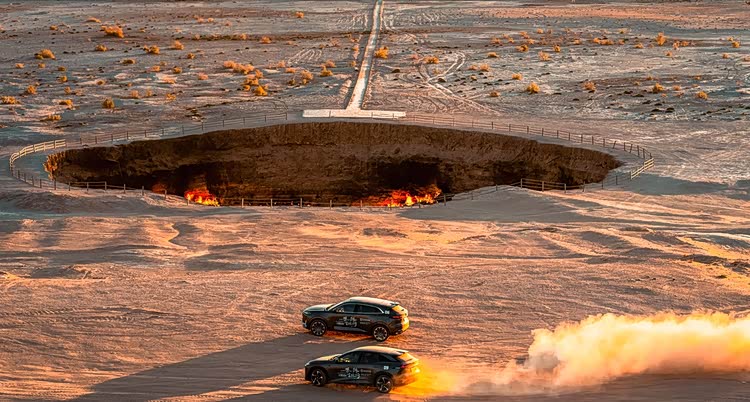 进入土库曼,第一站就是前往卡拉库姆沙漠地带的“地狱之门”。因其附近充斥着丰沛的天然气资源,其中一个天然气坑在被点燃后,形成了火焰燃烧五十一年而不熄灭的奇观。所以又被当地人称为“地狱之门”。