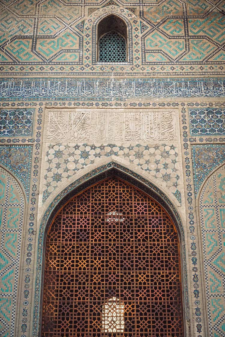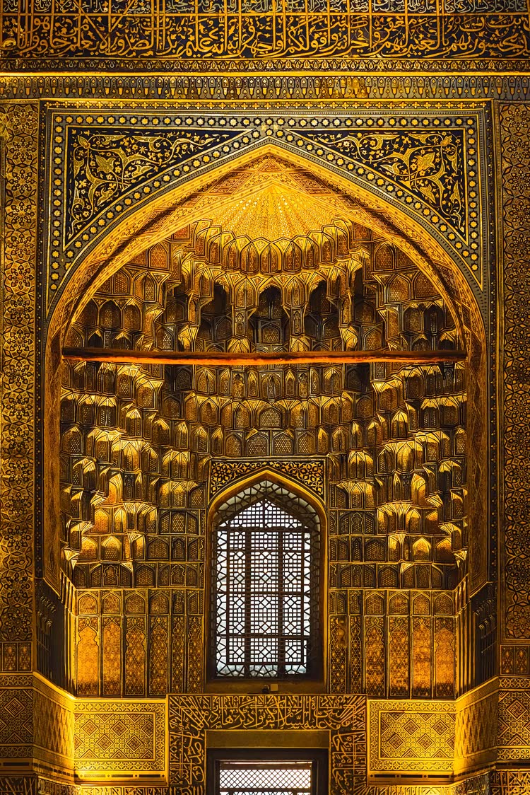 这座装饰华丽的陵墓,完全配得上帖木儿辉煌的一生。蓝绿色肋状穹顶下的陵墓,有着蜂窝状的拱顶壁龛,墙和天花板大量采用了描金石膏浮雕,在金色射灯的映照下更显金碧辉煌。