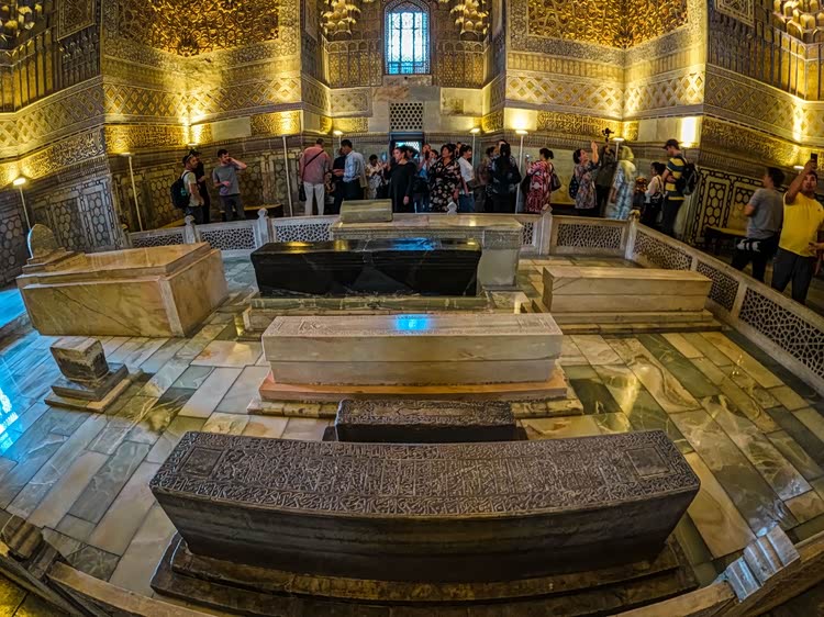 陵墓内共有9个石棺,遗体并不在里面,而在石棺下的地下墓穴里。中间排那块墨绿色(看起来是黑色)墓石属于帖木儿,两侧是帖木儿的两个孙子,单独占一排的是兀鲁伯,拥有“单间”的是帖木儿最尊敬的老师谢赫·赛义德·奥马尔,最小的两个是兀鲁伯的两个儿子。