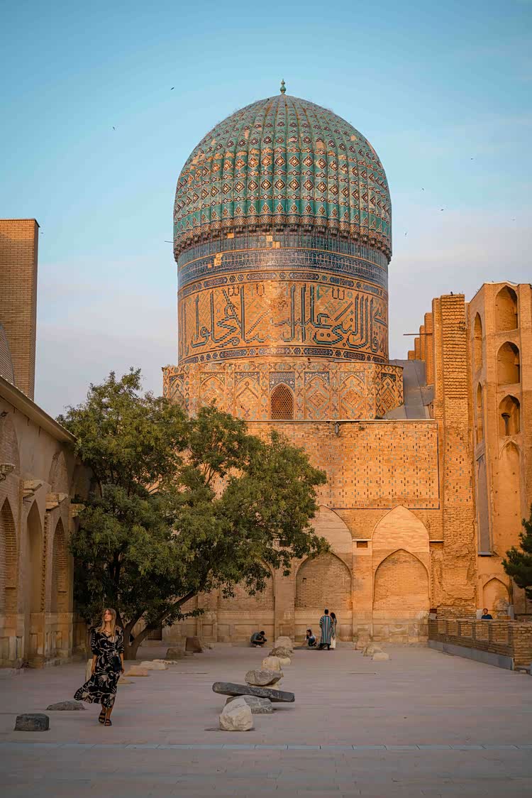 撒马尔罕的另一个建筑丰碑就是比比哈努姆清真寺。这是帖木儿为他的爱妻比比哈努姆所建。比比·哈努姆清真寺,修建于帖木儿时代,曾经是世界上最大的清真寺之一,高达41米的巨大贴花穹顶让它成为撒马尔罕最令人敬畏的建筑。这是帖木儿取得征战印度的胜利之后,决定建一座东方最大的清真寺,规模要超过世界所有的清真寺。清真寺自1399年开建,1404年建成。