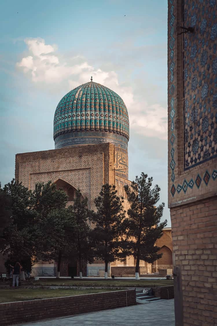 爱情的力量是伟大的,比比哈努姆清真寺的每个细节都美不胜收。外镶乌釉瓷砖,精雕花纹大理石,高耸的宣礼塔,巨大的蓝色穹顶装饰得整座建筑壮观无比,气势恢宏被誉为“全球最精美的建筑瑰宝”。