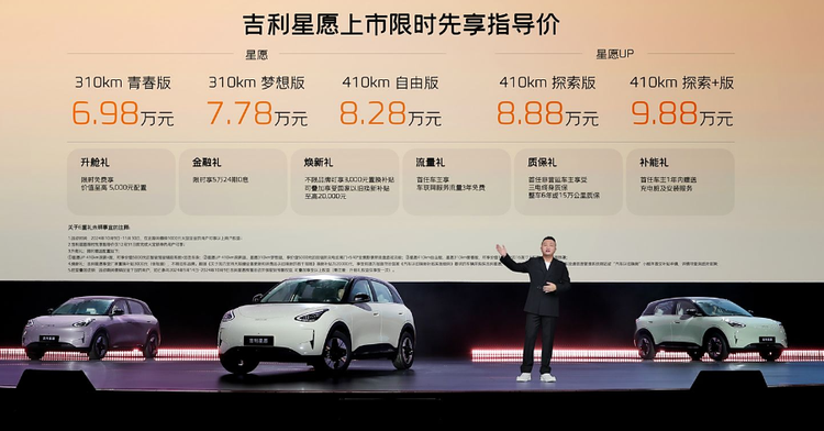目前,吉利 星愿(参数|询价)已正式上市,新车共推出5款配置,限时先享售价区间为6.98-9.88万元。新车作为一款入门级产品,搭载“GEOME”车标,将属于银河的智能精品小车系列,目标是打造成为10万以内纯电新标杆。