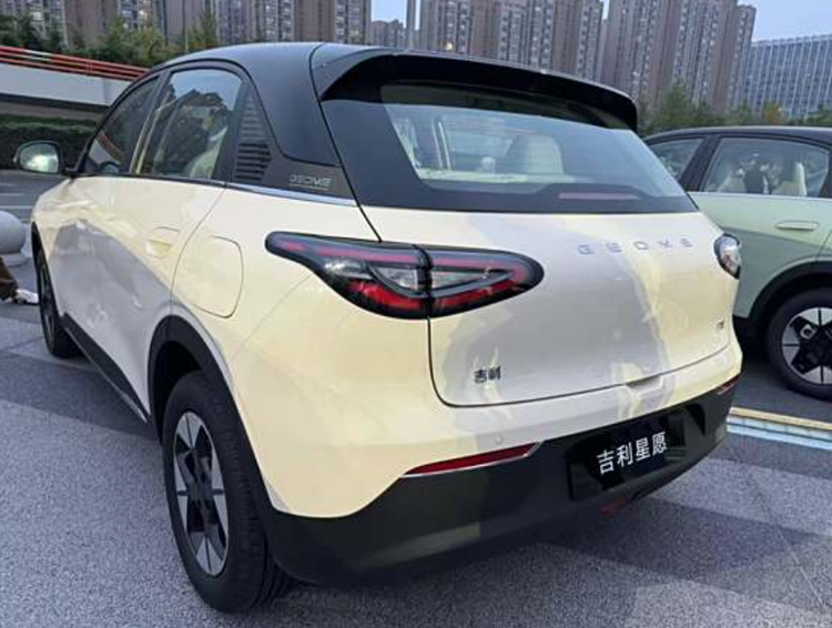 侧身侧面,吉利星愿营造出悬浮式车顶效果,贯穿式腰线点缀出车身的层次感,轮眉和侧裙部分还有黑色饰板,门把手采用了内凹式设计,下方还配有四辐式低风阻轮毂,看上去还是比较时尚的。