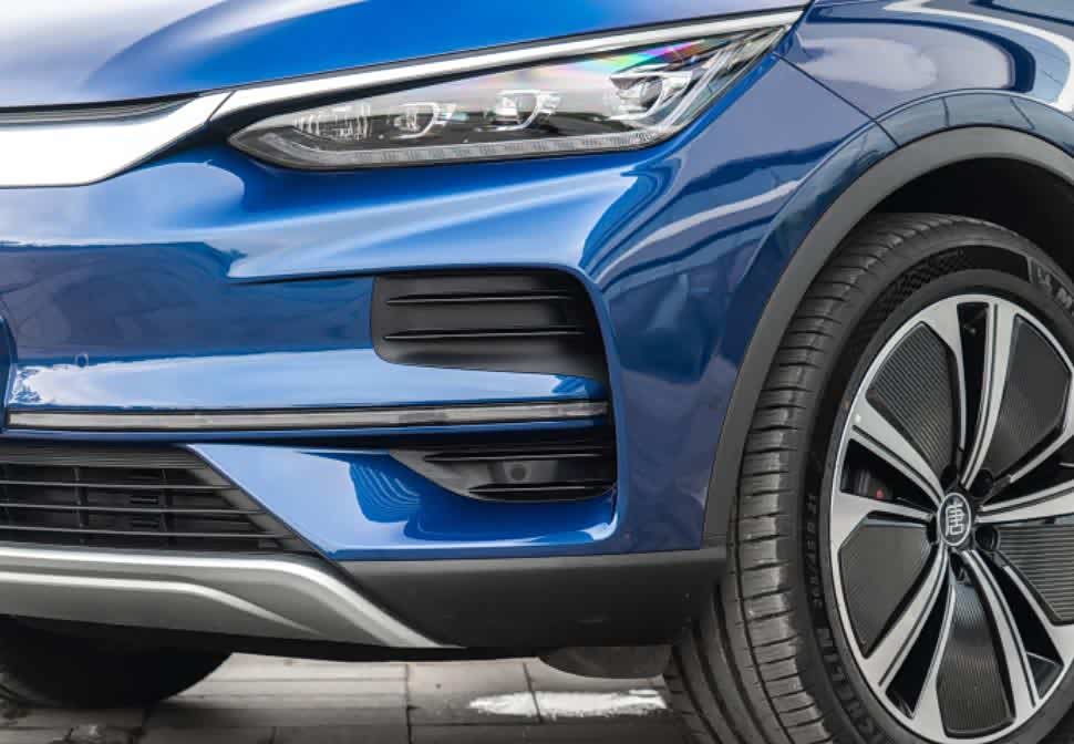新款唐EV的外观设计语言延续了比亚迪的最新家族风格,第一眼给人的感觉更像是SUV版的比亚迪汉。因为它的前脸同样选择了横向覆盖的银色镀铬饰条搭配封闭式格栅,饰条的中间位置有“唐”的中文字样,两侧是经典的三角形灯腔,内部灯源自然是时下主流的LED。侧面的轮廓变化并不大,但是轮毂造型做出了变更,换装了全新的低风阻造型,对于后续续航的提升会有一定的帮助。同时,新款比亚迪唐EV增加了独特的“极光蓝”配色,该配色有巴斯夫自主研发的专利技术,利用这项技术进行喷涂,获得的颜色更纯粹。