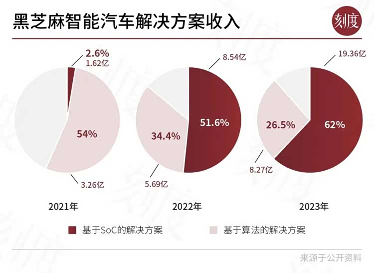 与之相对的是黑芝麻智能从2021年到2023年,产品解决方案的收入从161.5万增加到1.94亿,该项收入占比从2.6%增加到62%;授权及服务的收入从3264.6万增加到8270.5万,该项收入占比从54%下降到26.5%。