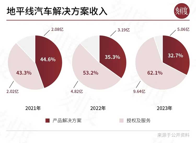 2021年到2023年,地平线产品解决方案的收入从2.08亿增加到5.06亿,该项收入占比从44.6%下降到32.7%;授权及服务的收入从2.02亿增加到9.64亿,该项收入占比从43.3%上升到62.1%,即超过了总收入的一半。