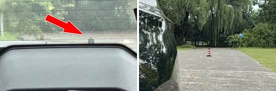 在前方视野测试环节,我们采用高70cm的桩桶作为参照物,随后调整车距,直至在主驾驶位可以看到桩桶上沿。经过测试,桩桶与车头最终测得的数据为2.952m,在测试过的同级别车型中处于上游水平。