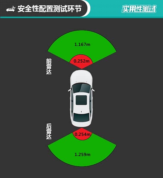前驻车雷达最远可在1.167m处感应到前方物体,持续蜂鸣提示距离为0.252m,同样与测试经验值相差不大。