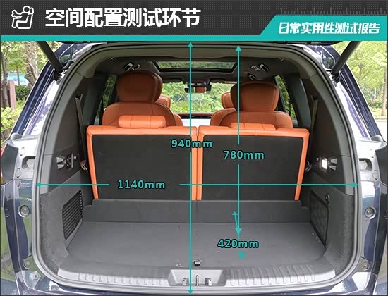 对于评测车后备厢的基础数值,我们也进行了实测,开口长度为940mm;开口宽度为1140mm;后备厢进深为420mm;后备厢地台与顶部的垂直高度为780mm。