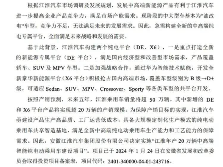 此外,安徽省生态环境厅已受理公示江淮汽车年产20万辆中高端智能纯电动乘用车建设项目环境影响报告书。报告书显示,江淮汽车将投资约39.8亿元建设新工厂,预计年产量达20万辆。