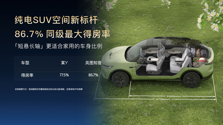 在车内空间设计方面,岚图知音凭借高达86.7%的车内得房率,充分展现了其在空间利用率上的优越性,重新定义了纯电SUV的豪华舒适标准。