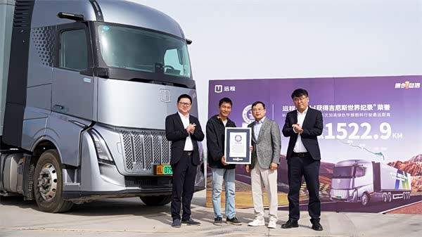 2024年10月17日,远程星瀚H醇氢电动牵引车从甘肃武威出发一路开到新疆吐鲁番,仅靠一箱甲醇就顺利跑完1522.9公里,成功挑战吉尼斯世界纪录TM称号,并获得“半挂式混合动力卡车单次加满绿色甲醇燃料行驶最远距离”荣誉称号。