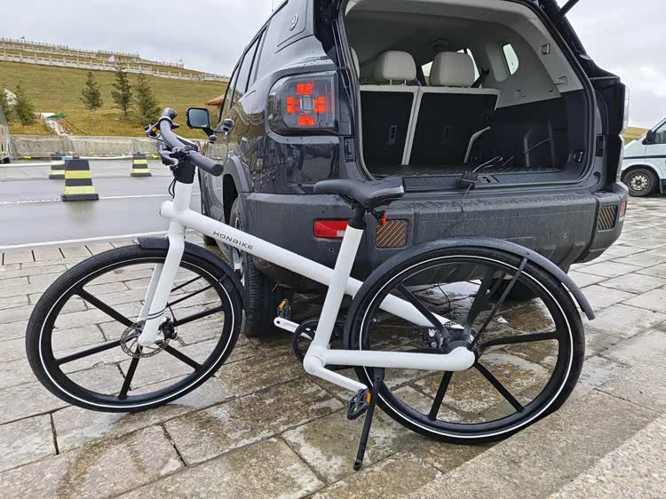 另外后备箱还配备了一个对外6.6kW的电源接口,外出露营接个电饭锅、电磁炉是一点问题都没有,甚至给随车带的电动助力自行车充电都是没有任何问题。