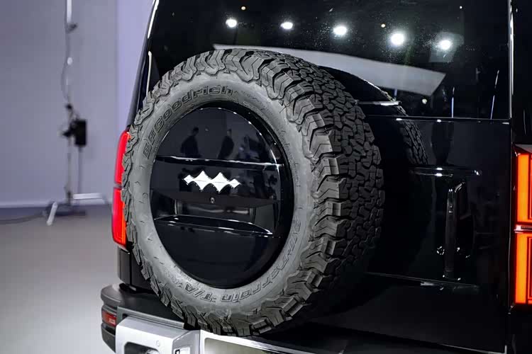 车尾部分,豹5采用了左右竖向布局尾灯组。为了免受后挂备胎的影响,豹5的后挡风玻璃上方还加入了高位刹车灯以及流媒体后视镜摄像头。后杠上的两个黑色拖车钩也给人特别硬朗的感觉。与大部分硬派越野车一样,豹5的尾门也采用侧开门设计,并且支持电吸。