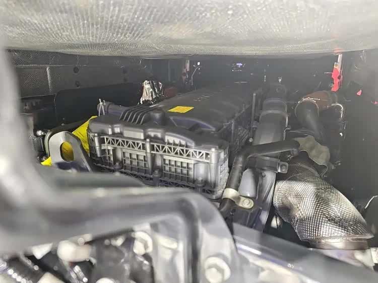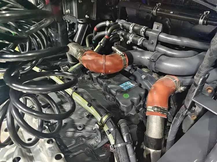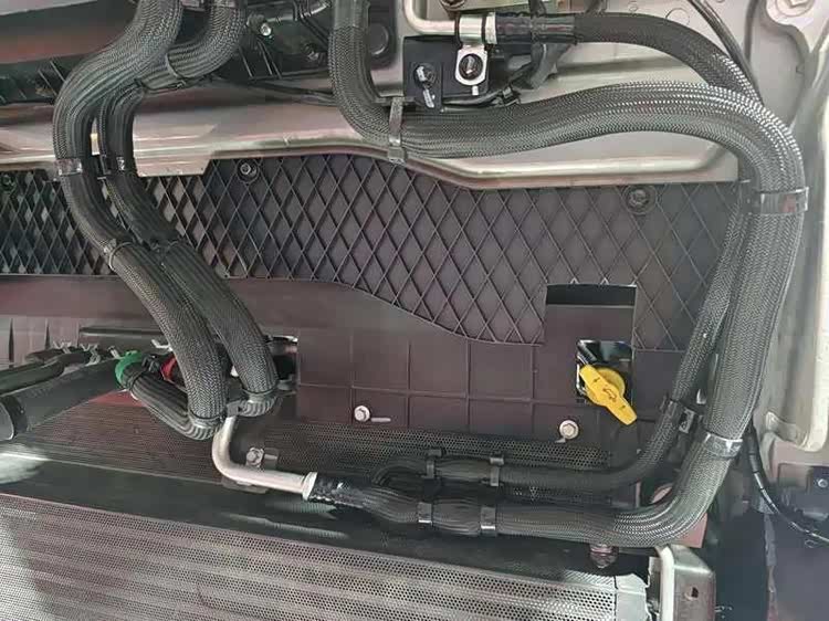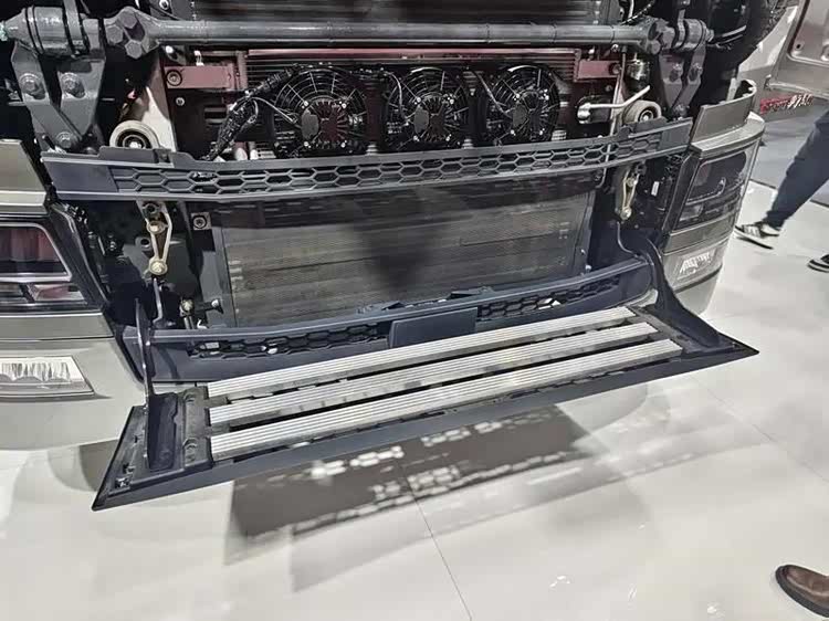 打开前面罩,左右两侧导流板也可以展开,可以看到左侧导流板内侧是车辆进气管道。HS7采用前置进气,取气口位于空气正压区,相比传统驾驶室侧面进气阻力更小,保证发动机运行供气充足,高原行驶动力不衰减。