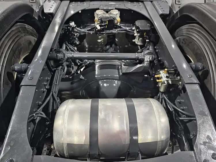 后桥采用I型推力杆,铝合金储气罐布置在车架中。
