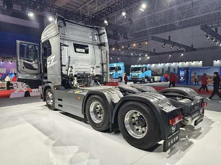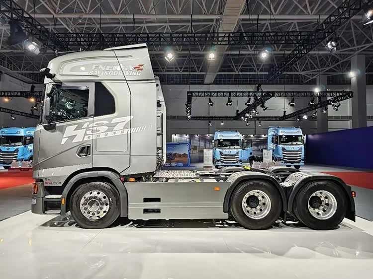 发布会现场正中央摆放了一辆高配的HS7 6×4燃油牵引车,该车定位快运市场。整车造型对标国外一线品牌,凭借大角度前风挡、电子后视镜、无极可调导流罩、侧裙板等设计,行车风阻系数低至0.473,综合油耗可降低3%。