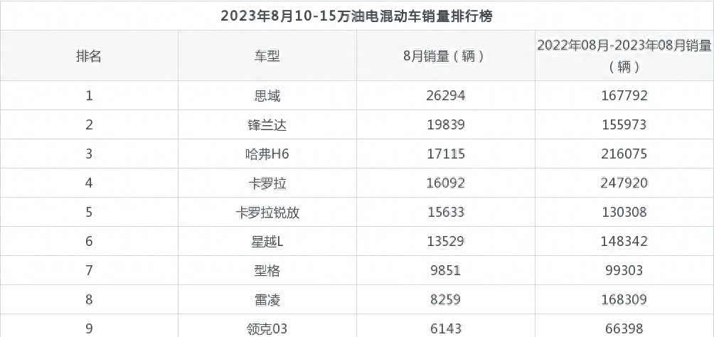 2023年8月的乘用车销量数据已经出炉,据众车网汽车行业数据监测显示,8月国内乘用车市场销量达到172.31万辆,同比下降6.17%,环比增长7.45%。每月各个细分市场的销量排行榜,也成为了大家所关注的话题,今天众车网为大家带来了,2023年8月10-15万油电混动车的销量排行榜单,有哪些车型能跻身销量榜呢?