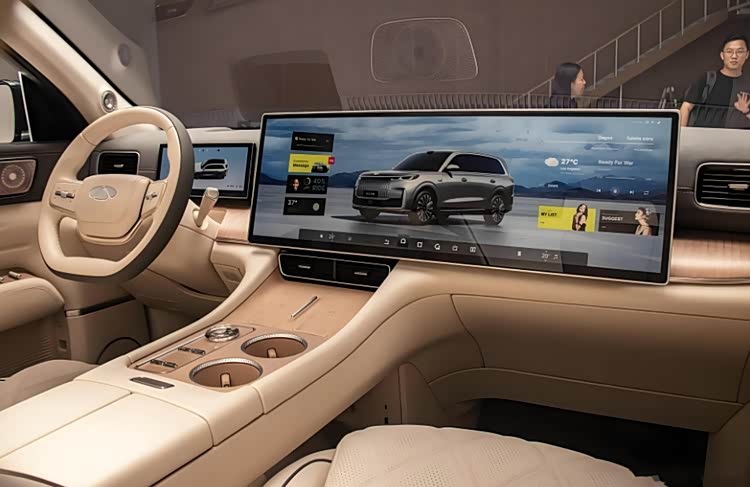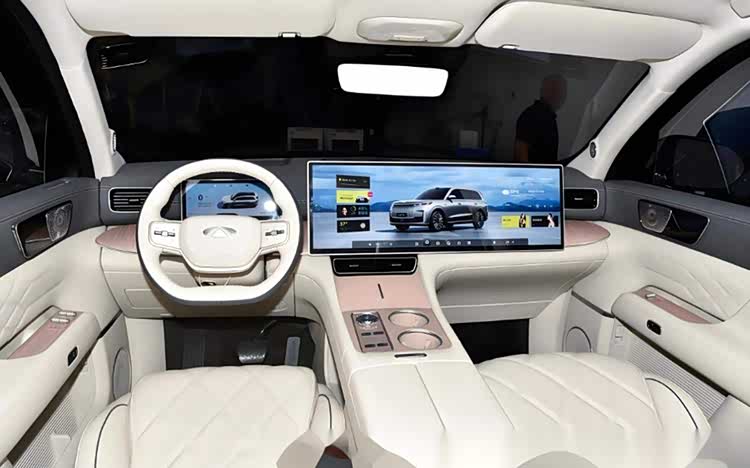 风云T11在车内的装饰方面展示了一种简洁而又略显粗糙的设计理念,它巧妙地融合了中控和副驾驶的娱乐显示屏。官方的报道指出,这款屏幕的尺寸已经扩大到30英寸,并配备了一个极为狭窄的边缘。显示屏内置了AI大型模型的语音助手等功能,其展示效果仍然依赖于玩家未来的实际体验。