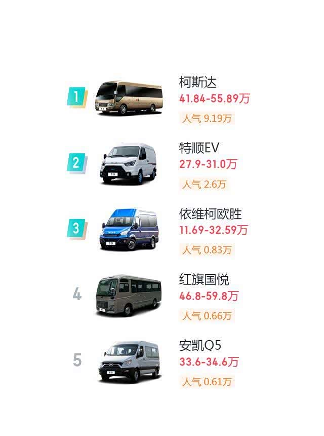 柯斯达在轻客汽车市场中人气火爆,人气指数高达9.19万。其外观设计和参数配置尚未透露,但从人气排名来看,柯斯达在轻客汽车领域具有极高的竞争力。其价格区间为41.84-55.89万,虽然价格较高,但依旧受到消费者的青睐。