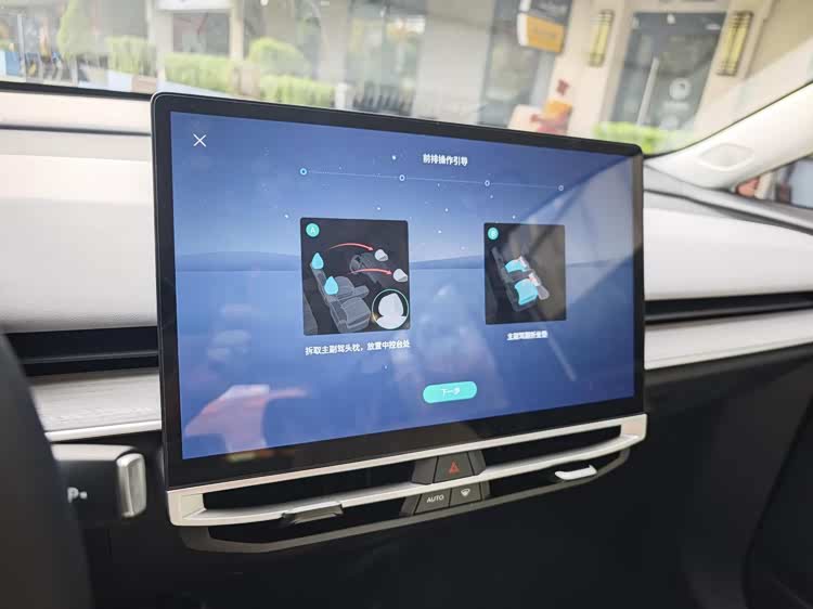 在整个放倒的过程中,车机都会全程指导,超长的仪表盘上方,可以很好的容纳卸下来的头枕,扶手箱上盖。