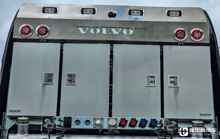 上层的储物箱采用双对开门设计,可容纳大件运输过程中所需的配件及耗材。在储物箱上方,POPP设计了高位保险杠,辅以高位车尾灯及VOLVO镂空字样,提示效果更好,同时更具精致感。
