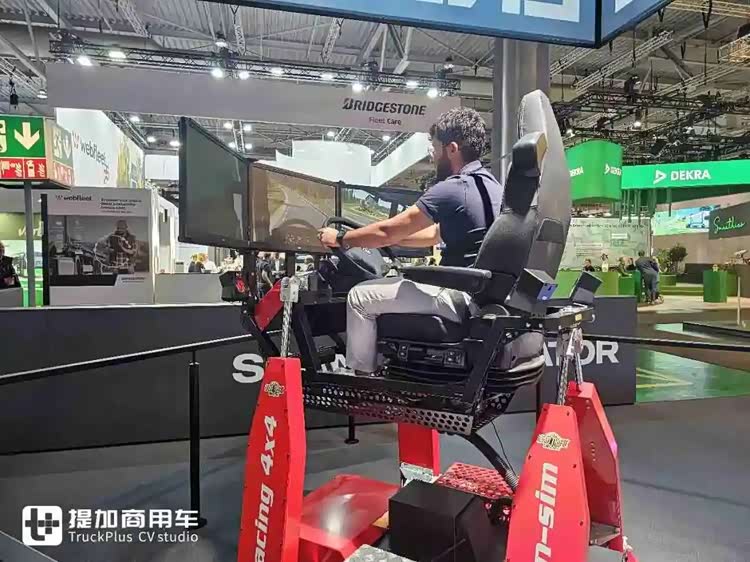 斯堪尼亚还带来了一个超真实的欧卡模拟器,可以根据方向角度、车辆行驶速度等因素,实现模拟驾驶室倾斜、颠簸等反应,让人坐在上面就有开真车的感觉。