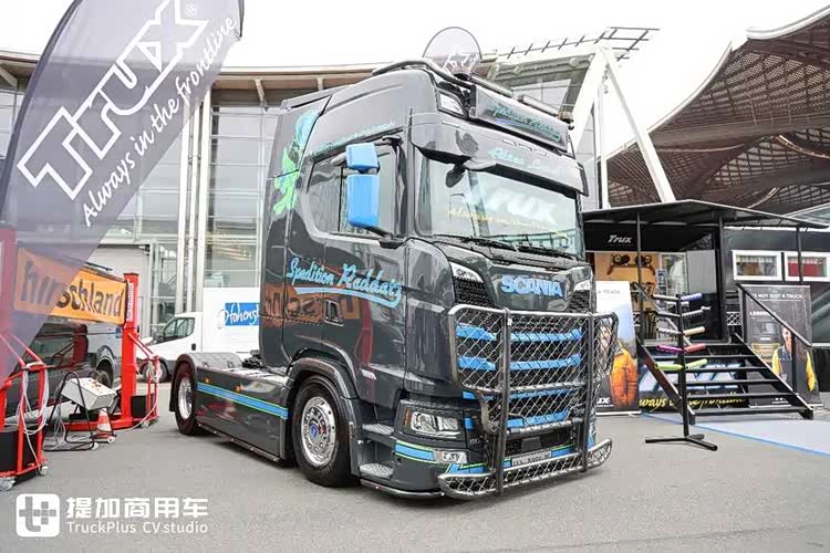这个是卖卡车改装件的,拿了一个斯堪尼亚500S,装上自己的产品来进行展示。国外的大众化改装风格也是牛栏、射灯、灯箱这些,不过国内很少能见到改牛栏的。