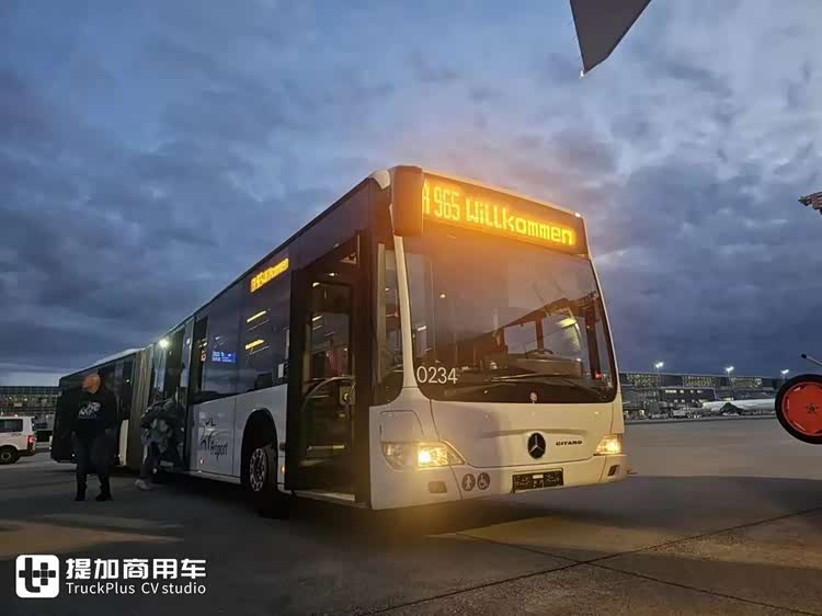 飞机没有停靠廊桥,需要坐摆渡车去到达层,法兰克福机场里面很少见到那种大的摆渡车,这种奔驰西塔罗的铰接巴士是主力军,这辆车的电子显示牌上写的还是CA965(航班号) Willkommen(德语欢迎的意思)