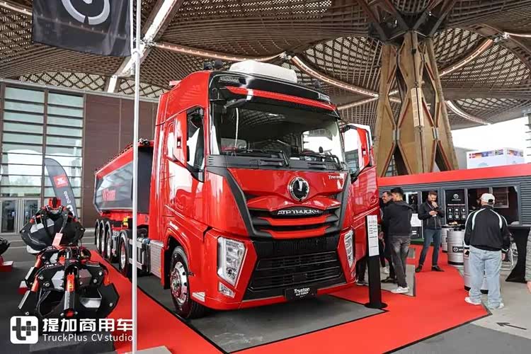从服务区回去之后就休息了,第二天正式去展馆工作,在去展馆的路上遇到一辆新德国曼牵引自卸车,前轴还带着静液压驱动。