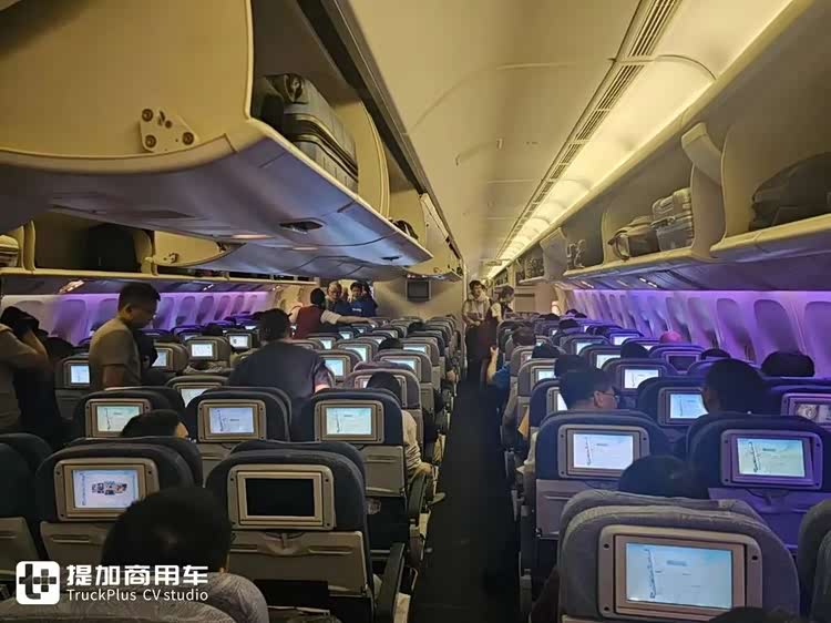坐的飞机是一个13年机龄的波音777-300,311个座位的宽体机,经济舱3+3+3的座椅布局还算舒服,我坐在最后一排,反正靠着厕所近,坐累了站站也方便。