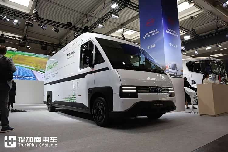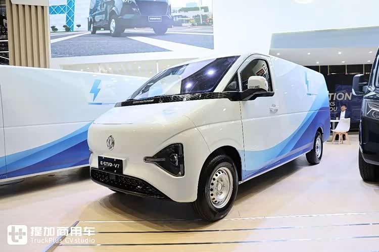 东风轻型车的新能源产品也来到了IAA,他们展出了一个国内还没有上的御风V5和V7,这两个是全新纯电平台设计的新能源物流车产品,尺寸小于御风V9+,据现场工作人员介绍,这款车后期也会替代现在的东风EM27L。