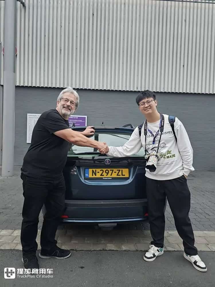 找到车主来个友好的车友见面合影,两个萨博车主碰在一起,即便语言不通,但还是能聊很多,可能只是一张图,或者手指一下某个部位零件,大家都心领神会,知道对方要表达什么。对了,大哥还说想要我车上的轮毂,我跟他说我想要他车上的拖车钩。