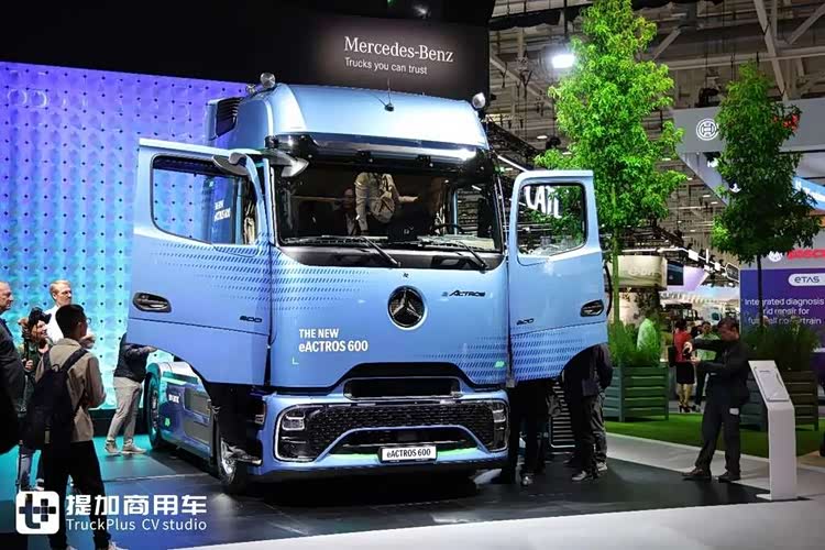 进展馆之后先去了奔驰的展台,因为奔驰的发布会开的最早,发布的是奔驰eActros和全新的Actros重卡,一款电车一款油车,现在的奔驰全新旗舰重卡采用的是油电同样的外观,封闭的格栅设计未来感很强,也是在无限的接近之前的future truck。