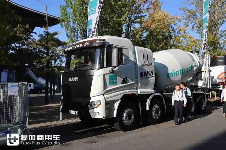 呀,发现一个三一纯电动搅拌车,国外版的这个搅拌车就没有那个类似奔驰的车标了。