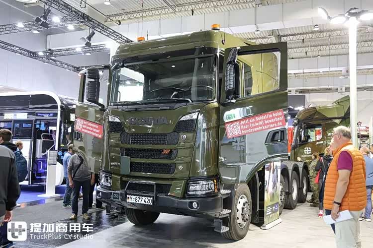 展馆里面有一个专门展示军车改装的,带来一个奔驰和一个斯堪尼亚的军车展示,这个斯堪尼亚8x6大件运输车就是他们专门改装给某国军方用来拉坦克用的。