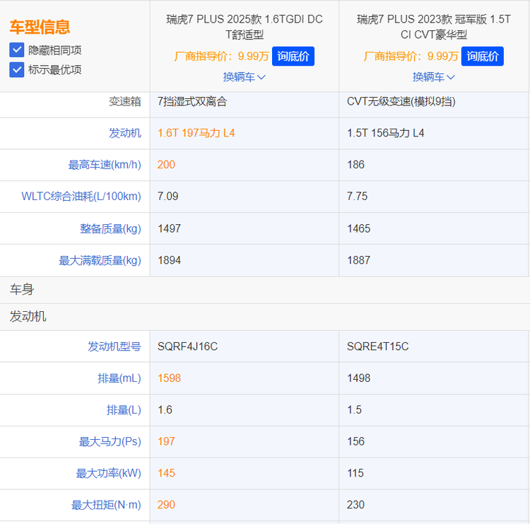 我们以2023款奇瑞瑞虎7 PLUS的入门版——冠军版 CVT豪华型与刚上市的入门版——1.6T舒适型进行比较,虽然两款车的指导价都是9.99万元,但差别还是很大的。