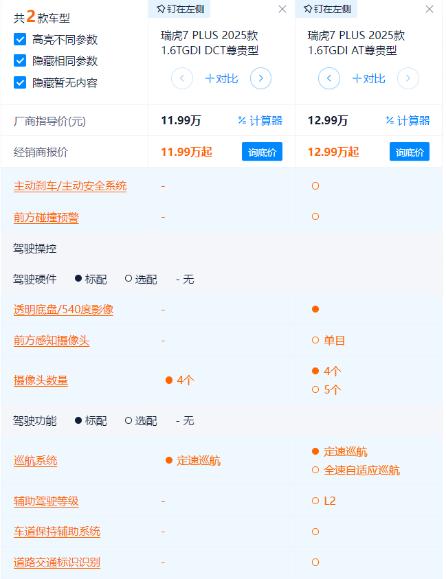 最后来看次顶配与顶配,两款都是尊贵型要怎么选呢?仔细来看,两款车在核心的动力上还是存在差异的。1.6TGDI DCT尊贵版使用的是7速湿式双离合DCT变速箱,1.6TGDI AT尊贵型使用的是8速自动变速器。二者在行驶质感上是存在一些差异的,比如8速自动变速器的换挡更顺畅,同时售价在12.99万的1.6TGDI AT尊贵型还配备了540度透明底盘、高通骁龙8155的芯片,同时还可以选装L2级驾驶辅助功能。