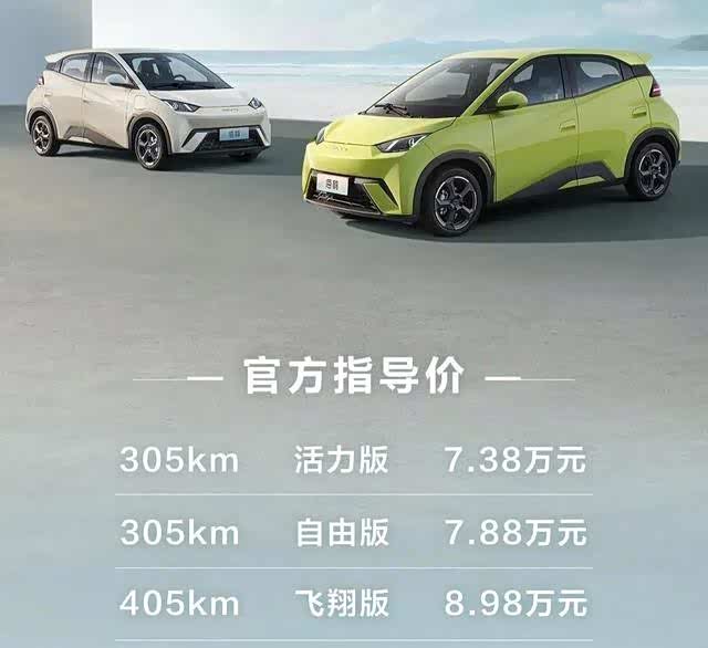 4月26日,比亚迪旗下纯电车海鸥上市。全系三个配置,分别是活力版,自由版,飞翔版,指导价7.38~8.98万。