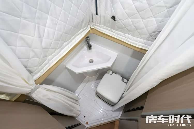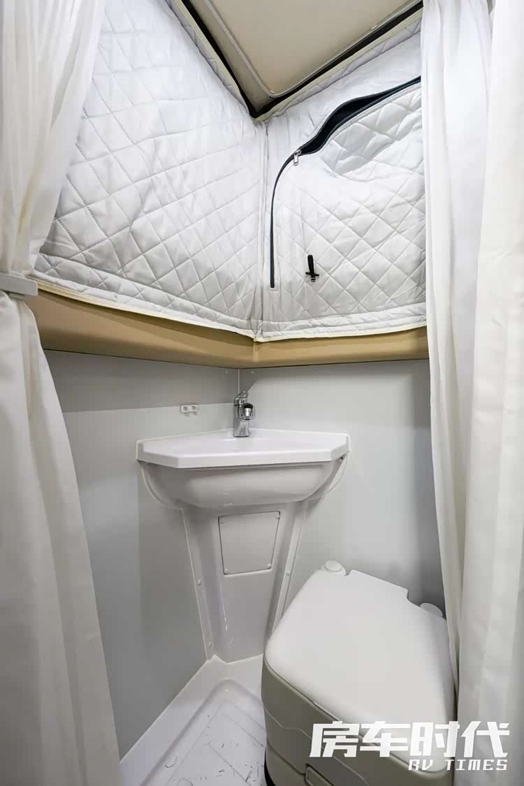 卫生间在车尾部,与一部分升顶房车采用软帘不同,这款车的卫生间升顶部分也采用了套筒式设计,以板材作为隔断,能够带来更好的隐私性。卫生间部分配有吸塑洗手台、双排水地漏、抽拉式淋浴花洒、卫浴帘、一体式马桶。用水上采用2kW储水式热水器。