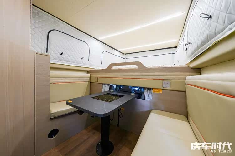 会客区的部分为四人对卡座,中间的小桌板可以自动式卡座桌(气动),台面上有一个电磁炉,降下小桌板可拼成1000×2000mm的单人床,适合儿童使用,结合额头床来看一家三口出游是足够应付的。