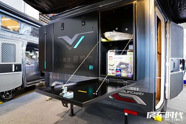 车身外侧配有2m长的270度手动遮阳棚(更新配置后此项已升级为标配),后侧美式乘客门+隐藏式纱门、外置式卡式炉等,车尾部的机甲外置物舱可赠送,不仅有储物功能,门板放下来还可以作为小桌板来使用。
