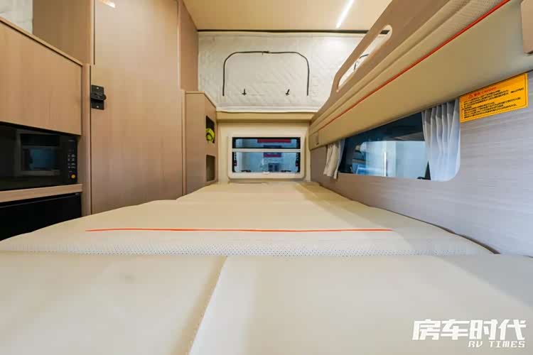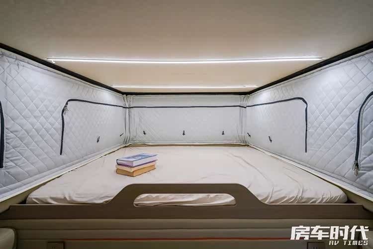额头床的部分由于是双排皮卡的设计,额头床的长度还是比较长的,尺寸达到了1765×1850mm,睡下两个人是真的没有压力,这也是车内唯一的固定床铺,尤其值得一提的是,与大部分的升顶房车“软窗”设计不同,这台车的额头处采用的是270度的环绕窗(上/下图中前方软帘拉开即可),笔者感受是采光非常好,观景的视角也很棒,视野几乎不受影响,当需要休息的时候拉上软帘,保护隐私的同时隔热隔音。