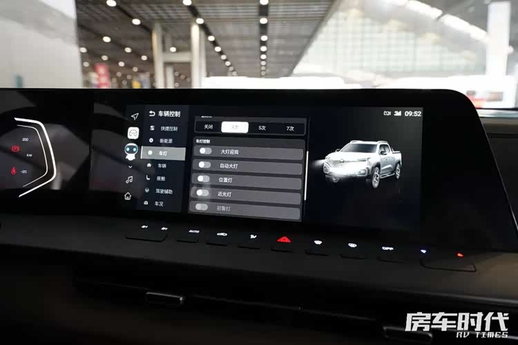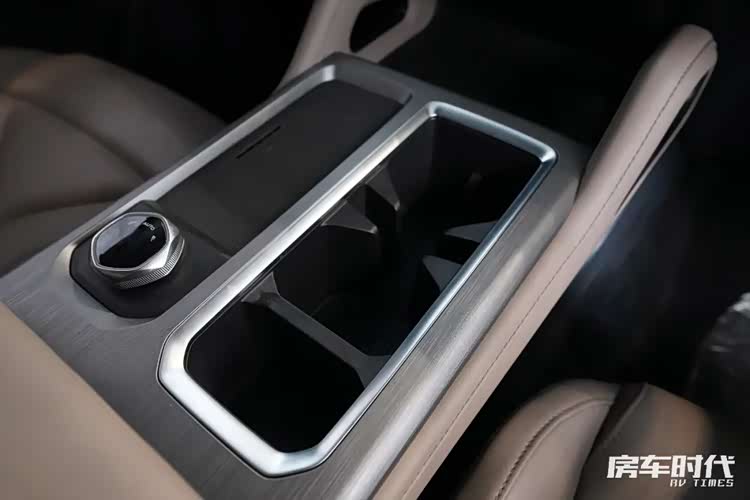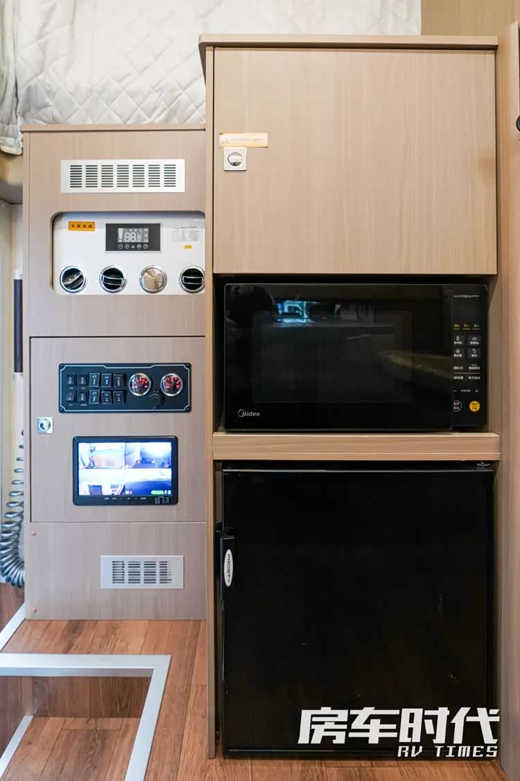 车内的厨房区域我比较倾向于称之为多功能区,配有微波炉、房车专用50L冰箱。侧边是一台房车专用分体式空调。下方是集成控制区域,还有四路监控屏。