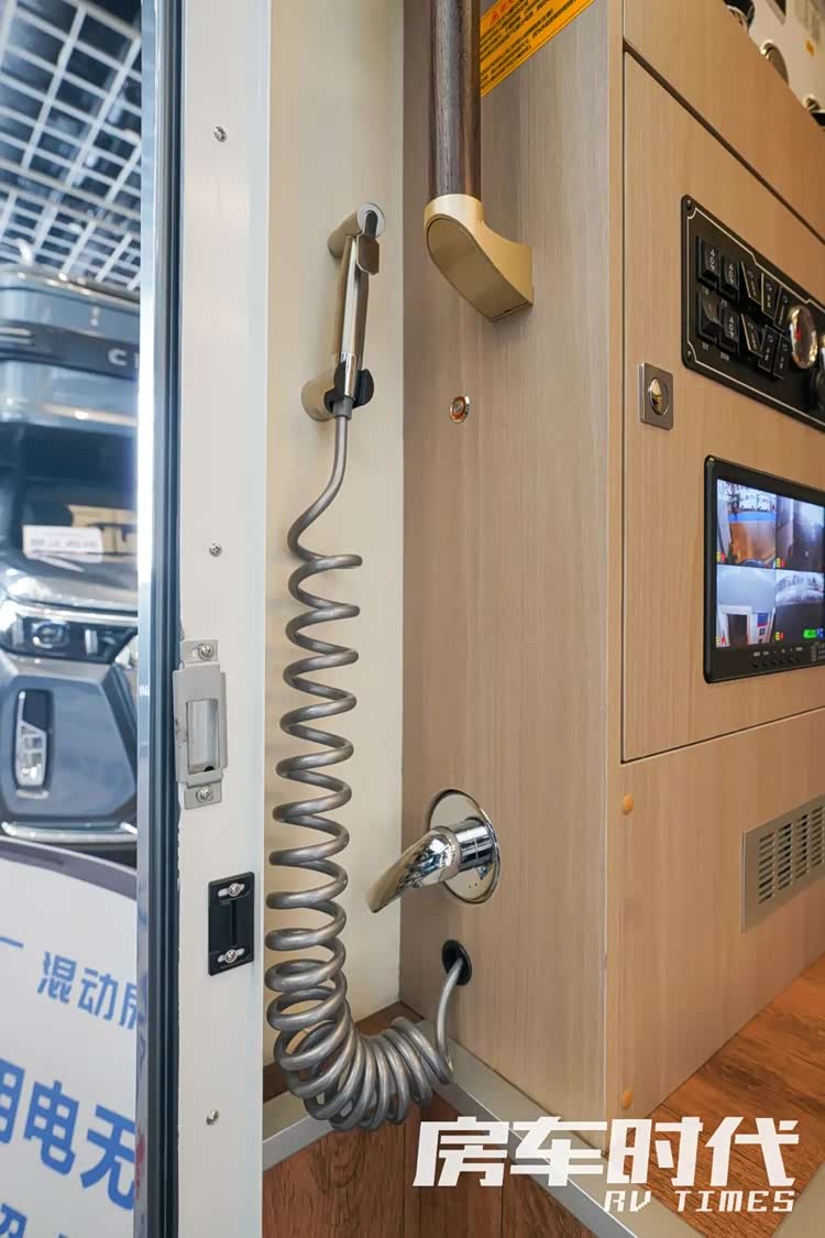 水电配置上,100L净水箱+50L灰水箱+手动排污阀(带延长水管),加水口采用重力加水口,电路采用原车的31.18度电,车内配有3kW逆变器,220V插座,电路保护装置、行车充电管理系统。入户门处还设计了户外淋浴,可以便于野外游玩时在车外冲洗灰尘。