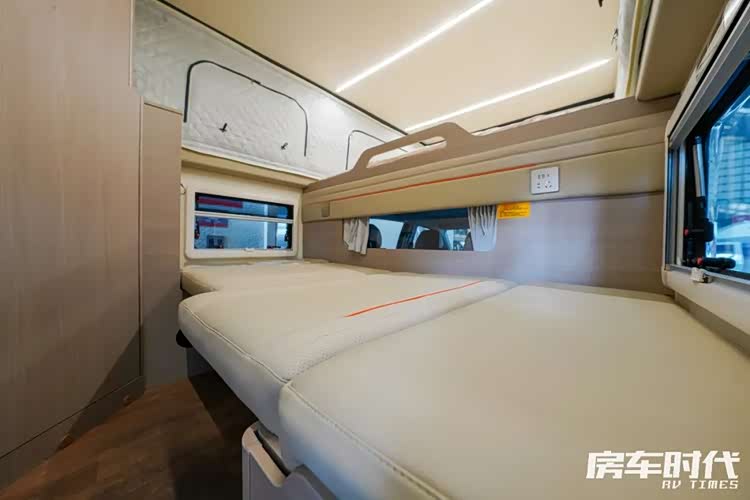 生活区内饰肤感纯色与木纹色两种色彩搭配可选,我们现场实拍的为木纹色,布局上与常见的双排皮卡房车一致,从前往后分别为额头床、会客区、卫生间与厨房区域。车内升顶后的高度达到了大约1950mm。笔者站在车内是完全没有感到压抑的。
