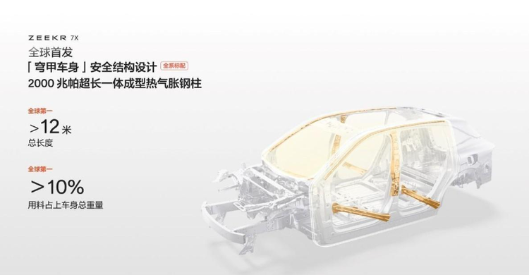 在众多家庭用户最看重的安全方面,极氪7X在实战中验证极氪式安全,成就新能源时代最安全的SUV。极氪7X全球首发的「穹甲车身」安全结构设计,采用行业最先进的一体成型热气胀工艺,全车多达10处应用潜艇级2000兆帕超高强度热成型钢材,总长度超过12米,占上车身总重量超过10%,全系标配,全球第一。其中包含两根一体成型热气胀管梁,从A柱一直延伸到后排头部,每一根的长度足足2.35米,中间没有任何铆接和焊点;还包含全车A柱、B柱还配备4个加强板,以及车门配备的4个防撞梁,使得极氪7X出厂即自带“穹甲”,不仅在碰撞标准工况表现拉满,更是在一些非标准工况,成为行业新标杆。